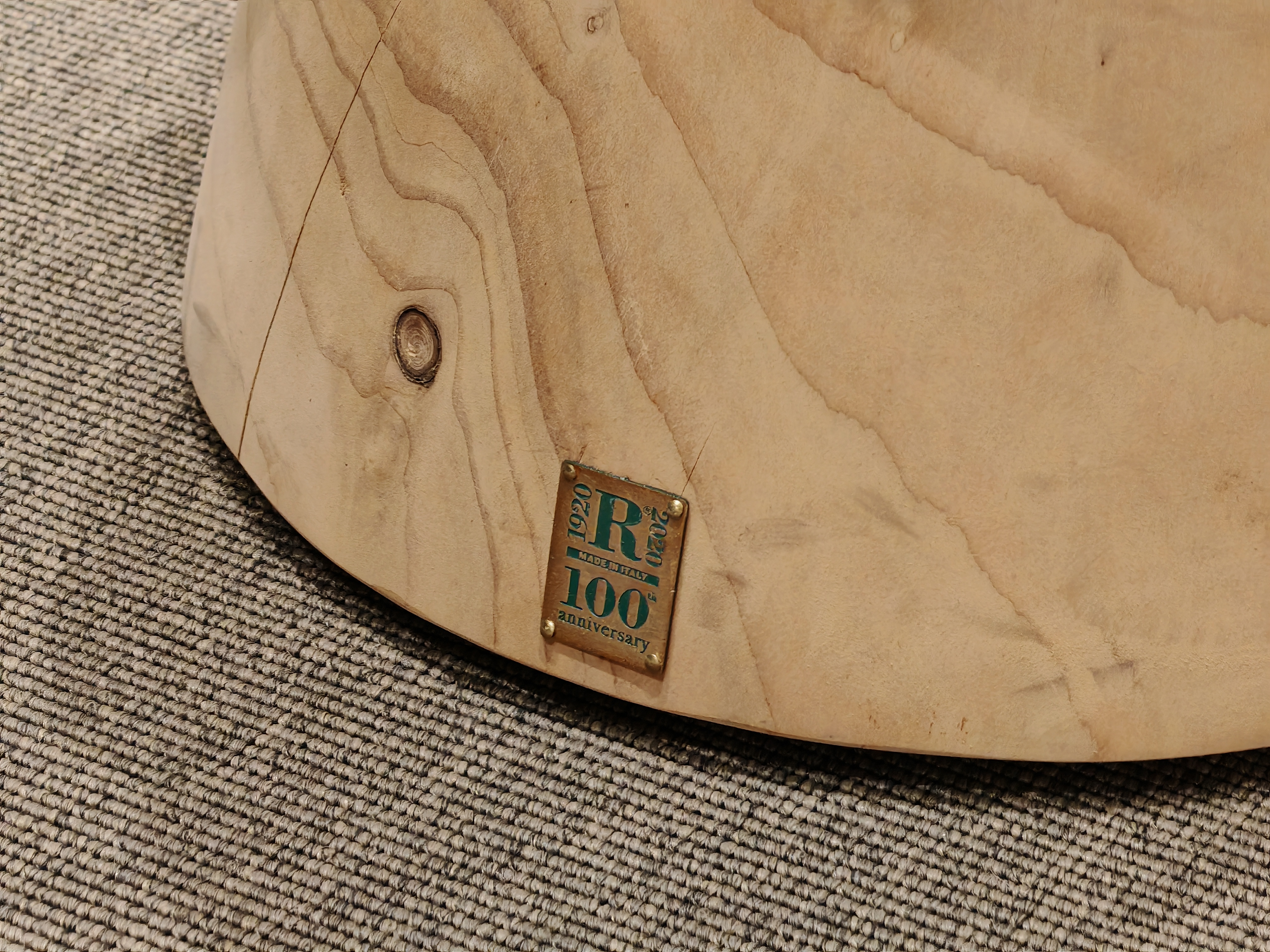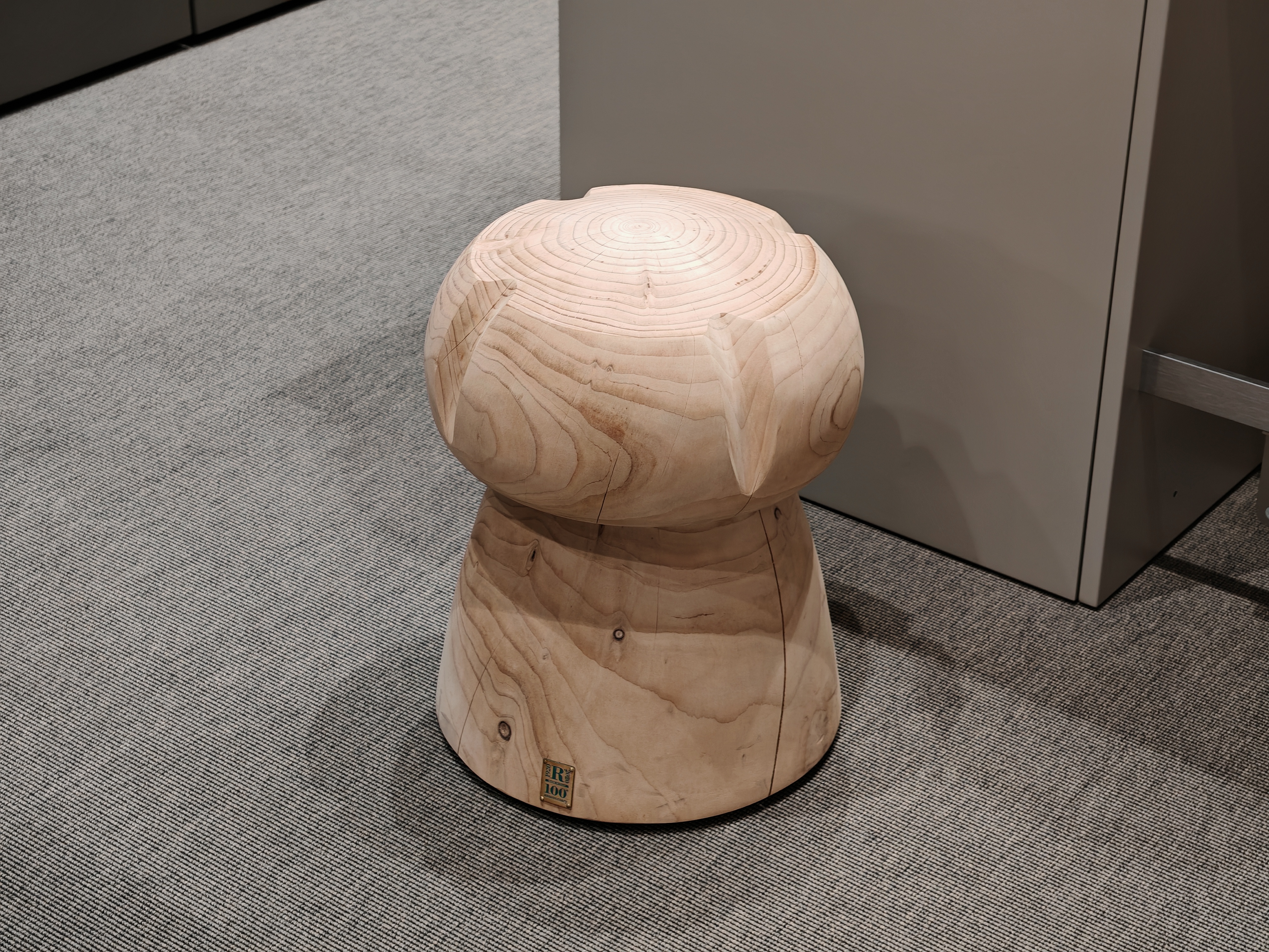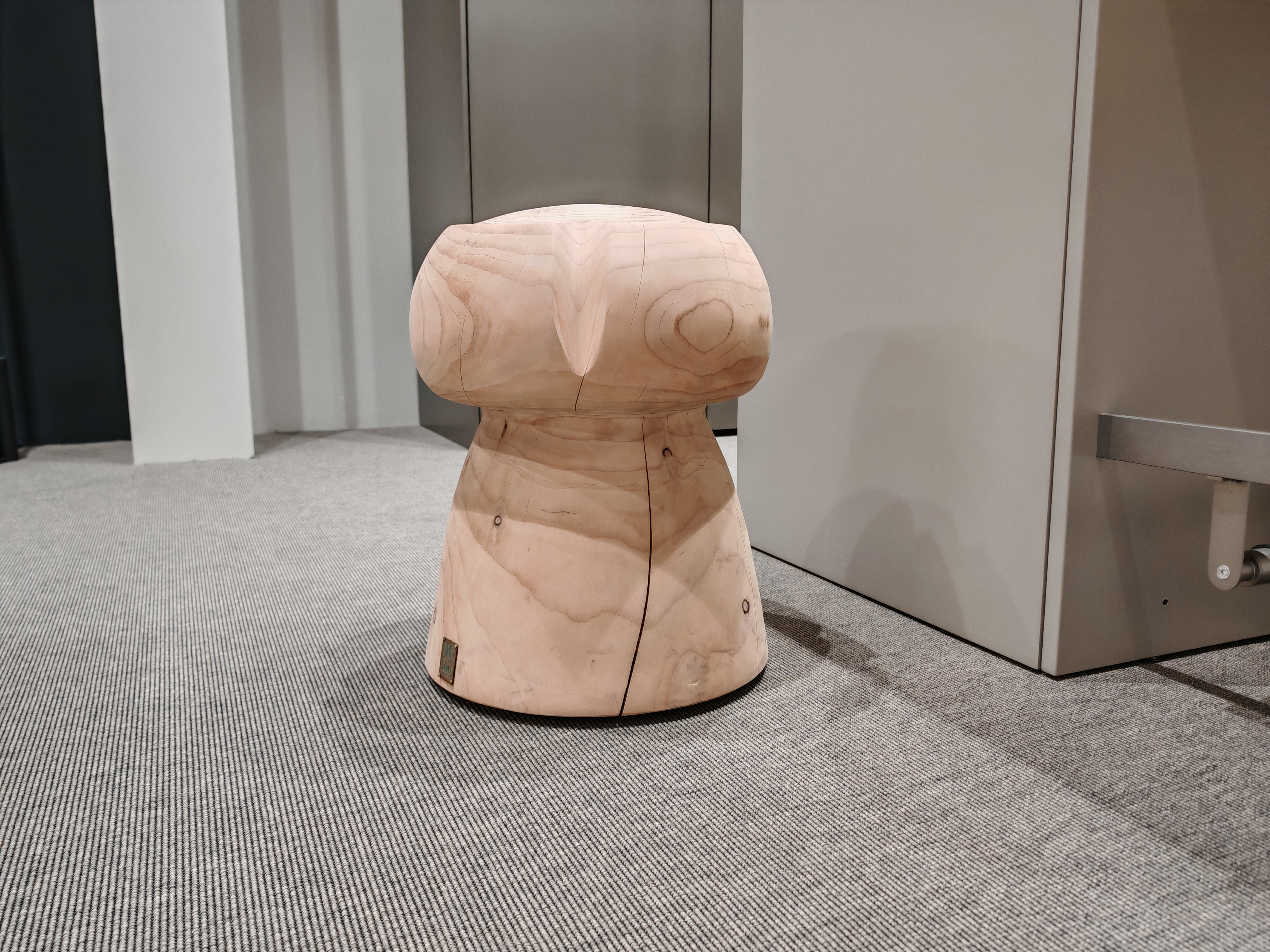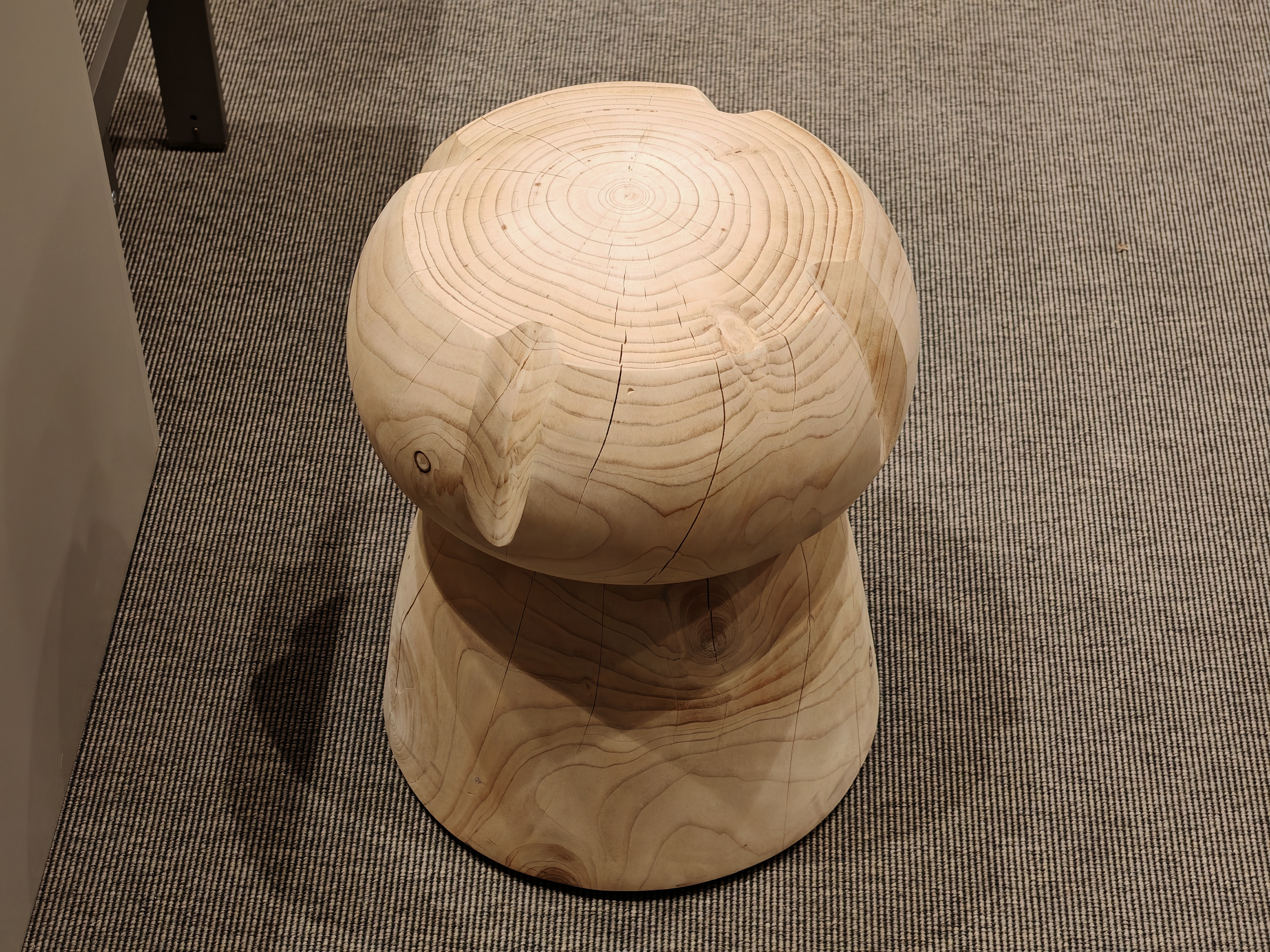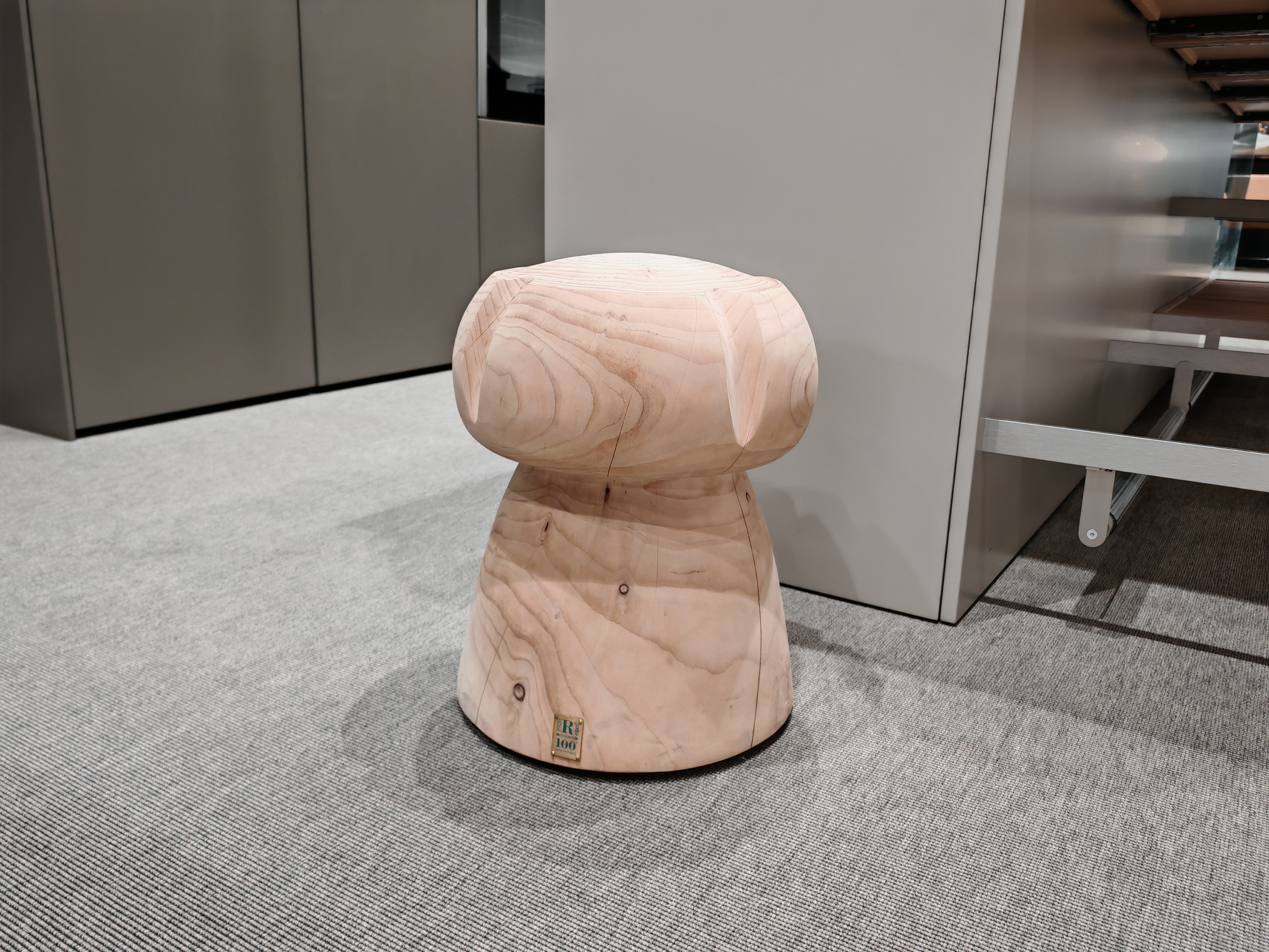 Sgabello in legno massello di cedro profumato lavorato da un blocco unico, rievocazione di un maxi tappo tipico delle bottiglie di Champagne.