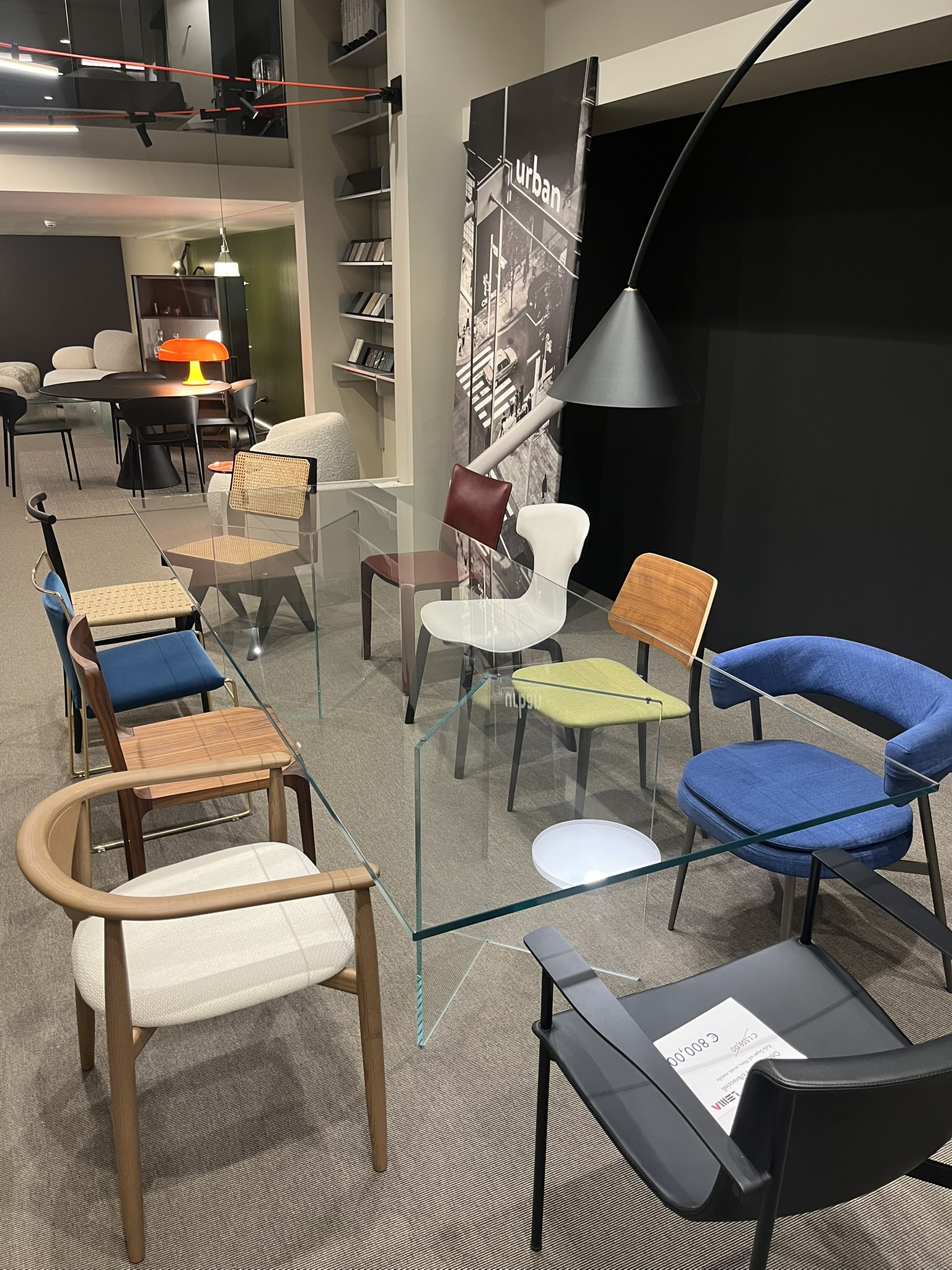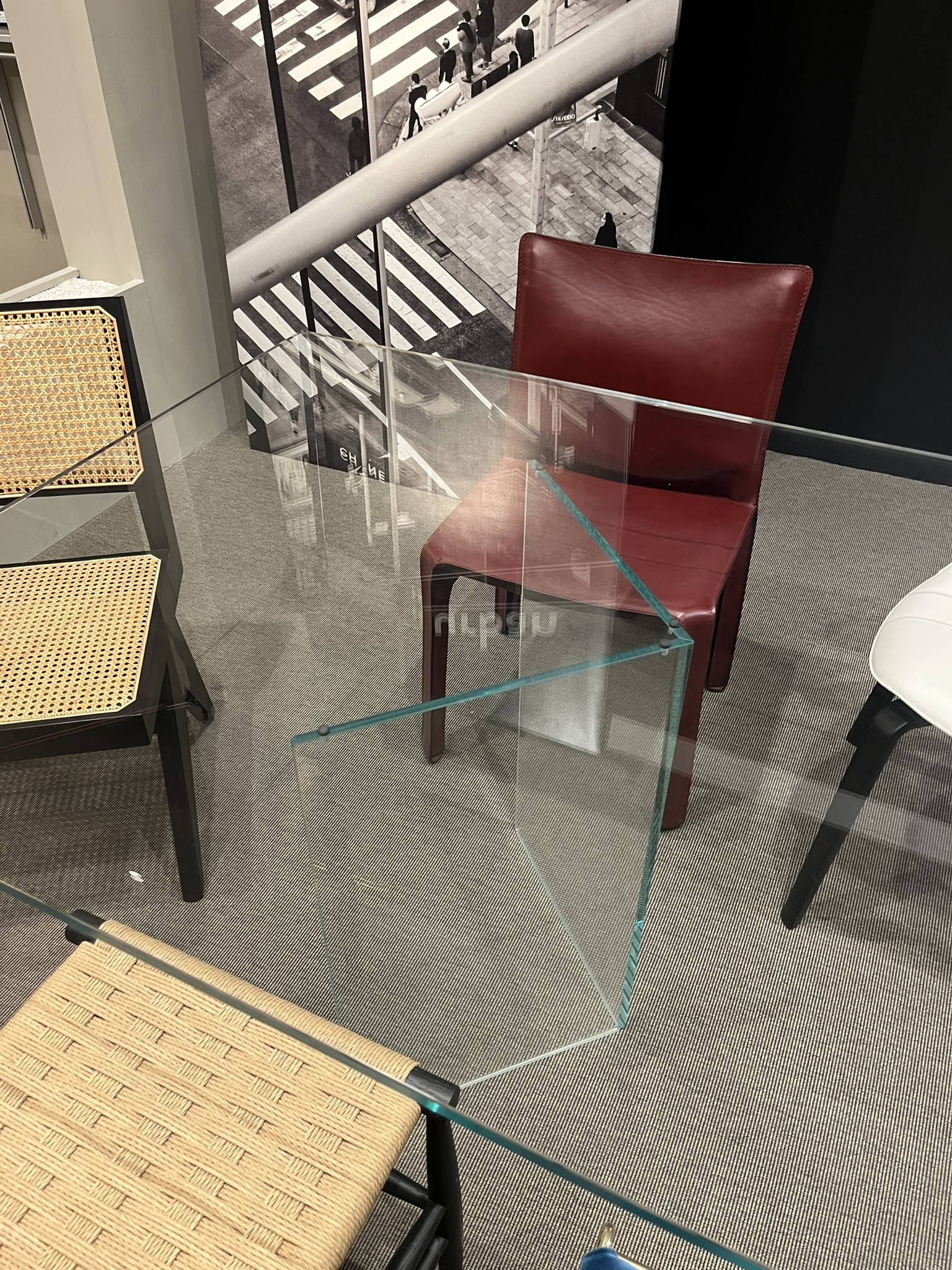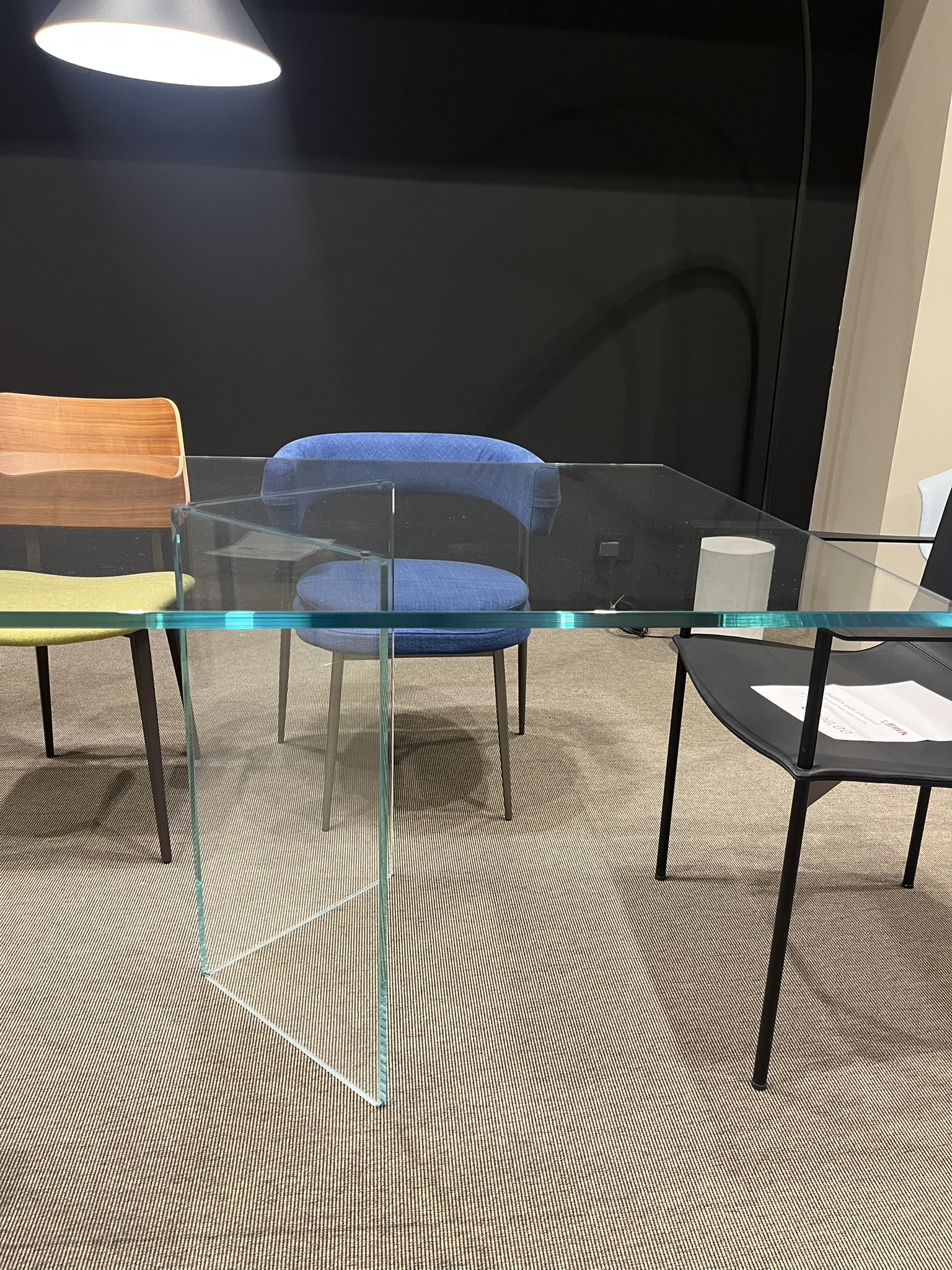Tavolo Bacco di Tonelli, con top e basamento in vetro trasparente di spessore mm 12. Le dimensioni del tavolo sono di cm 300x100xH73.