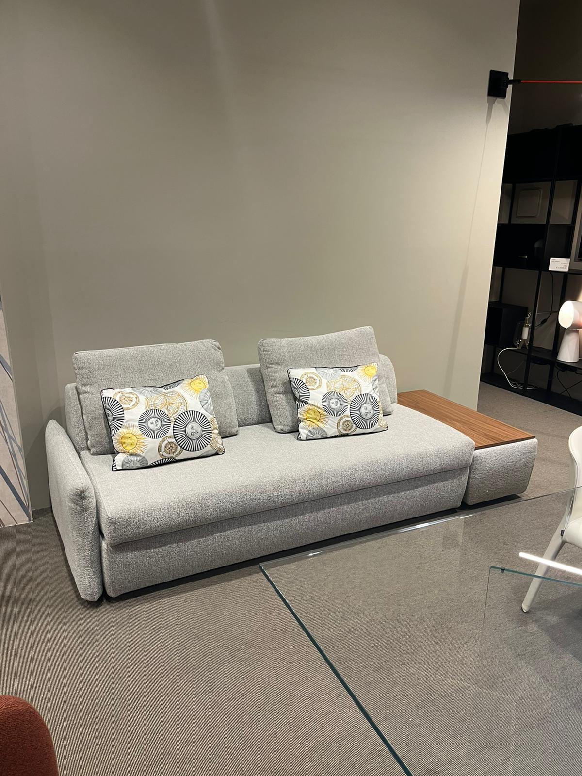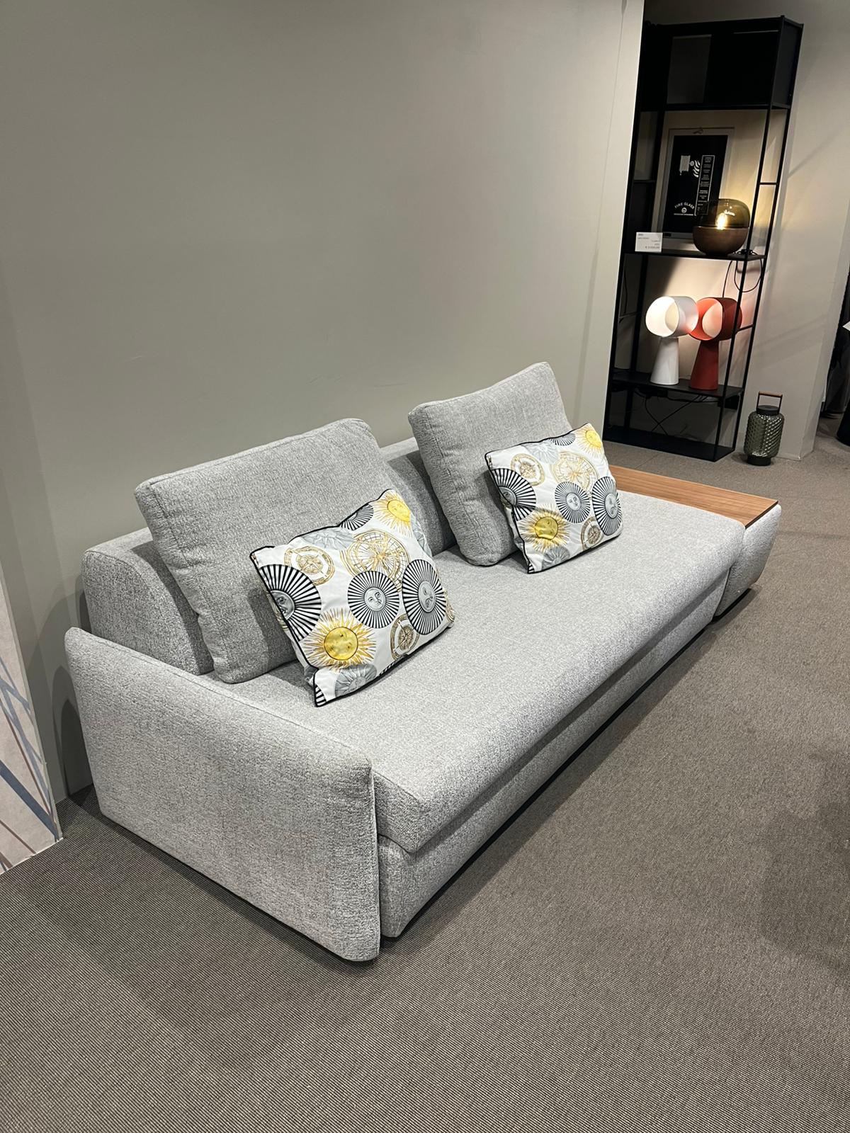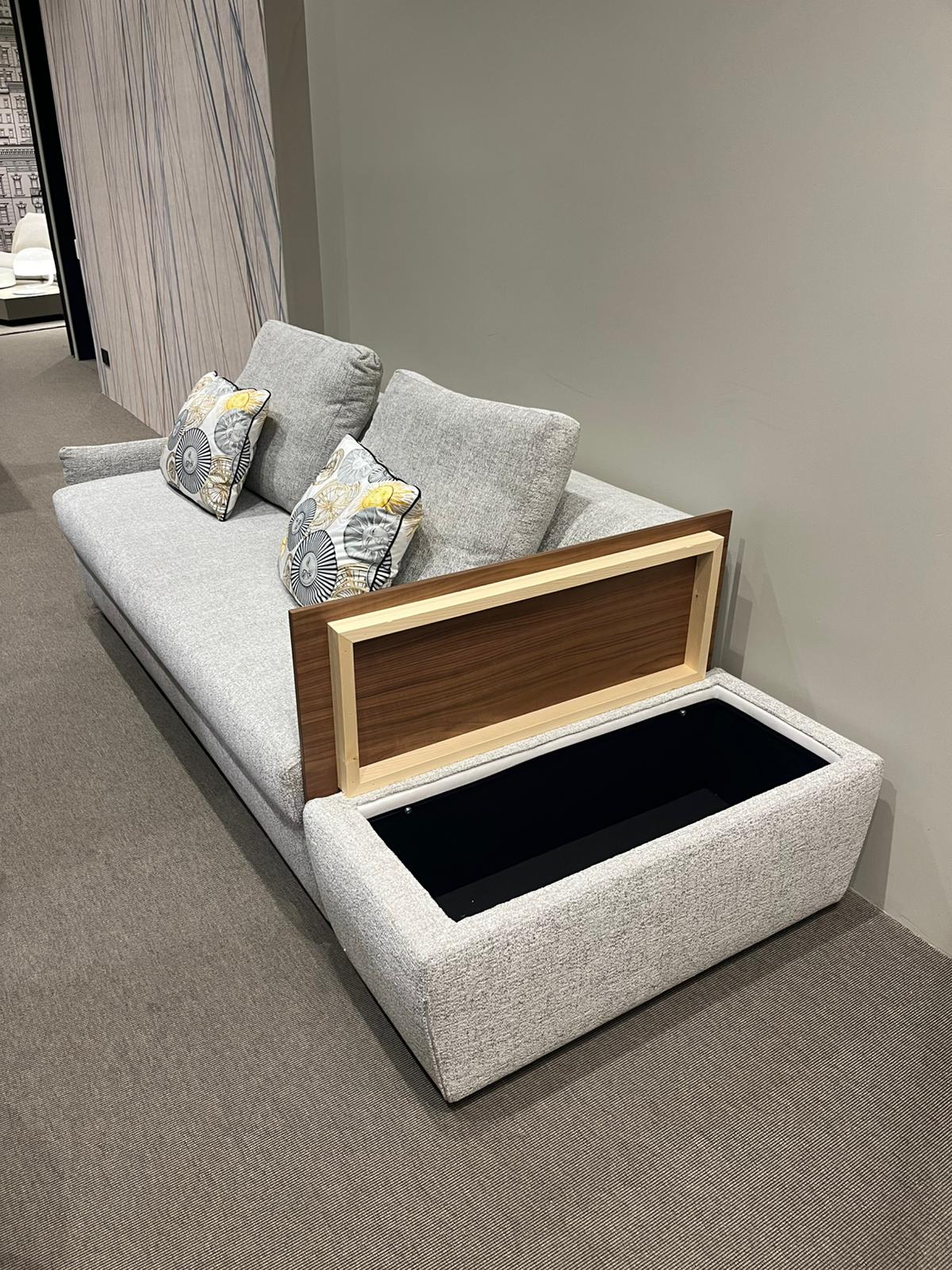 Composizione di un divano letto con un bracciolo e pouf contenitore con piano in legno tinto noce canaletto e base con ruote. L’apertura del divano letto è frontale e avviene tramite sollevamento. Il rivestimento del divano letto, sfoderabile, in tessuto Fred 3 (cat. Extra) e il materasso è ortopedico dalle dimensioni di cm 190x160xH13 in espanso. Il pouf contenitore ha le dimensioni di cm 45x100xH42, con rivestimento sfoderabile coordinato al divano letto.