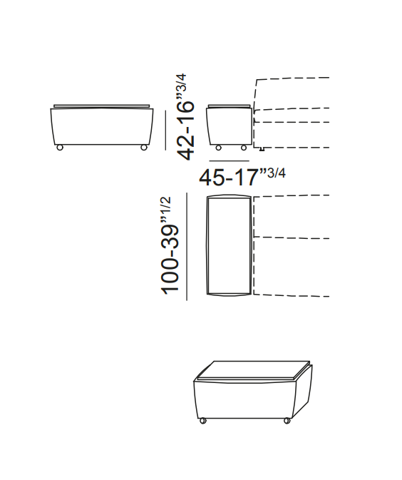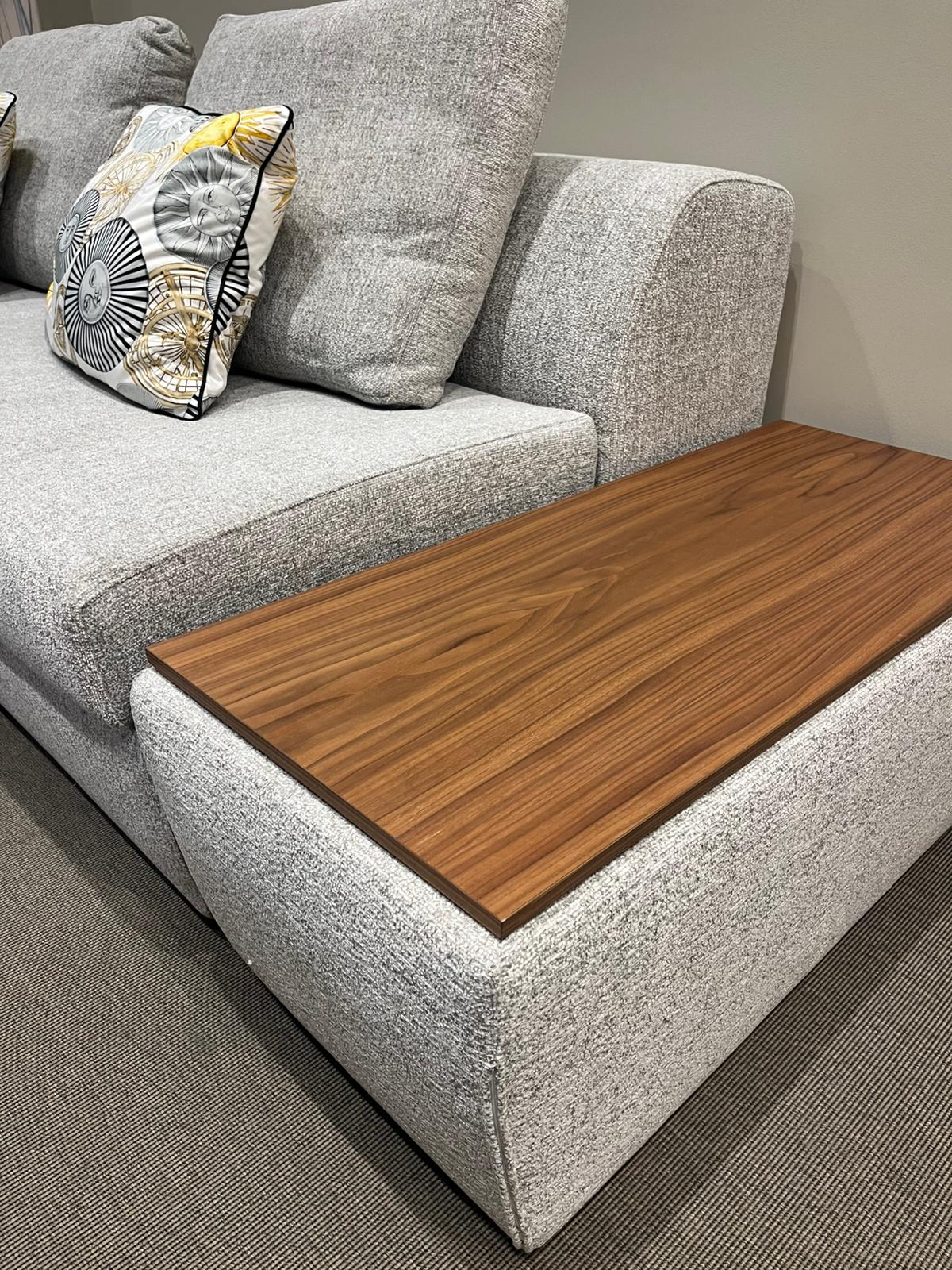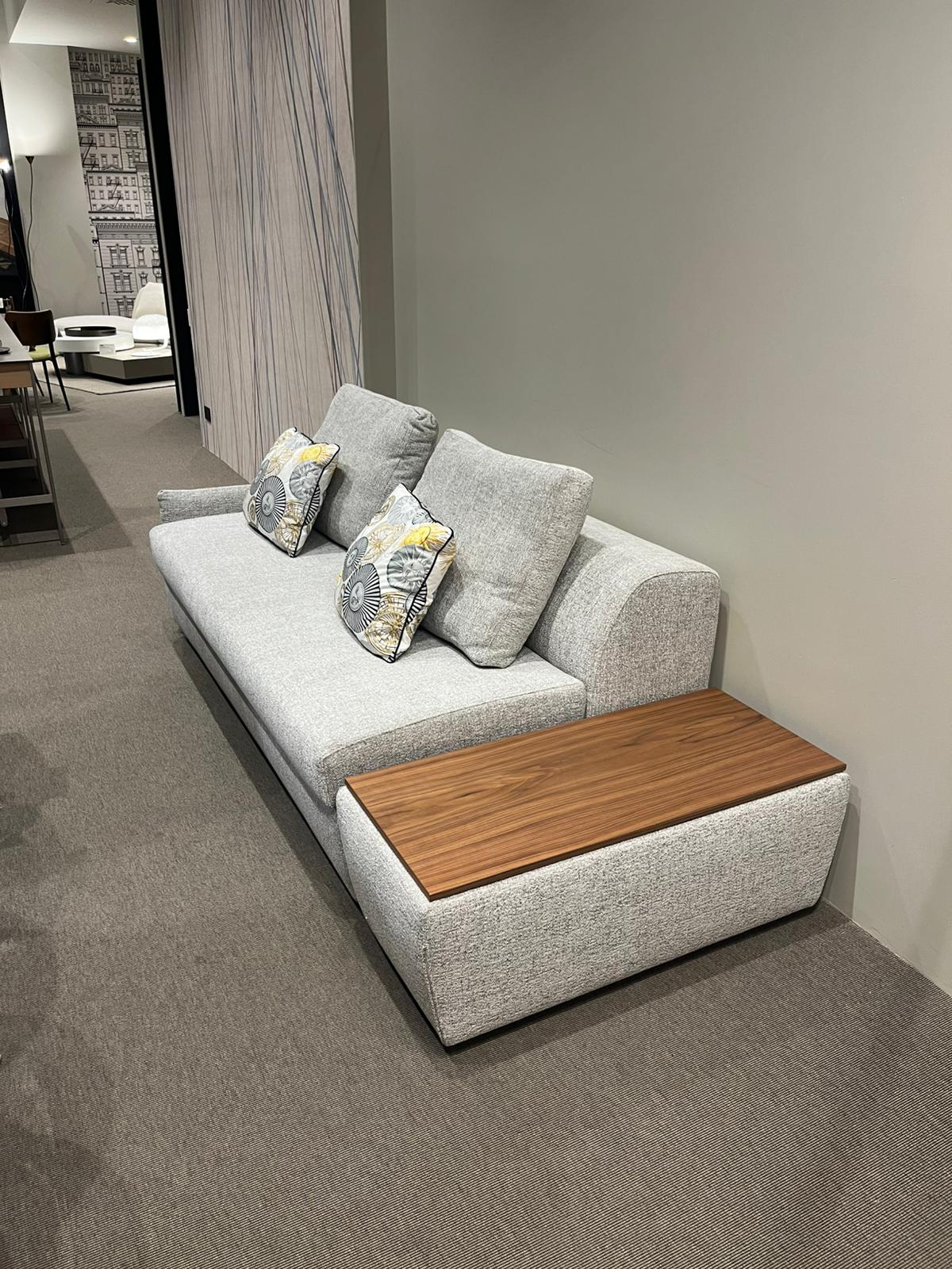 Composizione di un divano letto con un bracciolo e pouf contenitore con piano in legno tinto noce canaletto e base con ruote. L’apertura del divano letto è frontale e avviene tramite sollevamento. Il rivestimento del divano letto, sfoderabile, in tessuto Fred 3 (cat. Extra) e il materasso è ortopedico dalle dimensioni di cm 190x160xH13 in espanso. Il pouf contenitore ha le dimensioni di cm 45x100xH42, con rivestimento sfoderabile coordinato al divano letto.