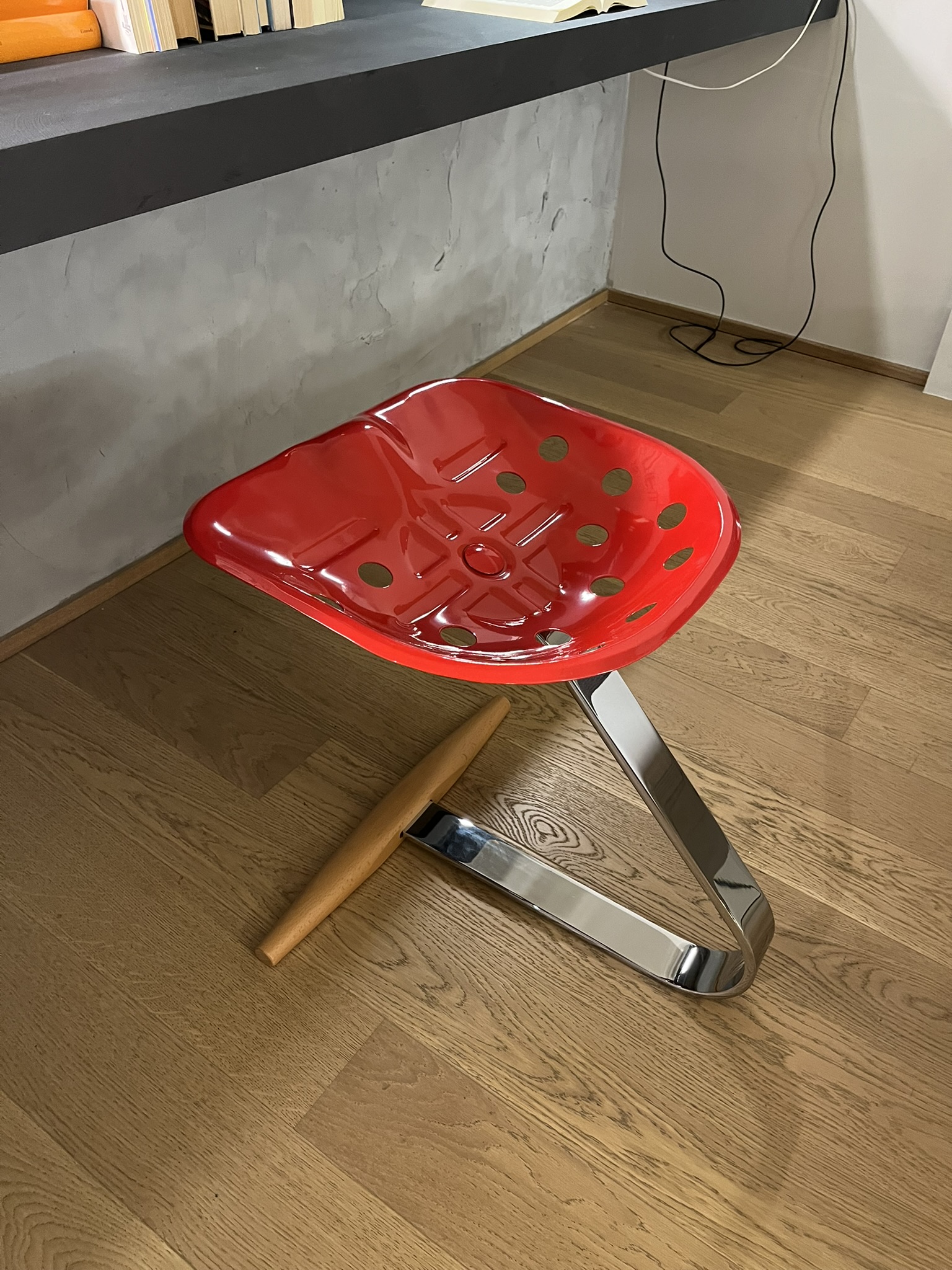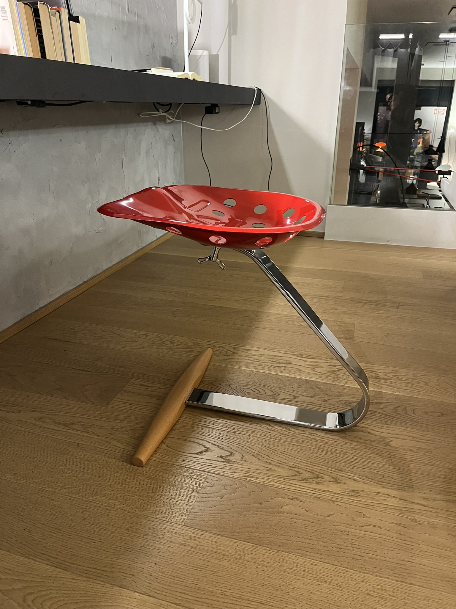 Sgabello Mezzadro di Zanotta, disegno di Achille e Pier Giacomo Castiglioni, con struttura in acciaio cromato, sedile verniciato Rosso, base in faggio evaporato. Le dimensioni dello sgabello sono di cm 49x51xH51.